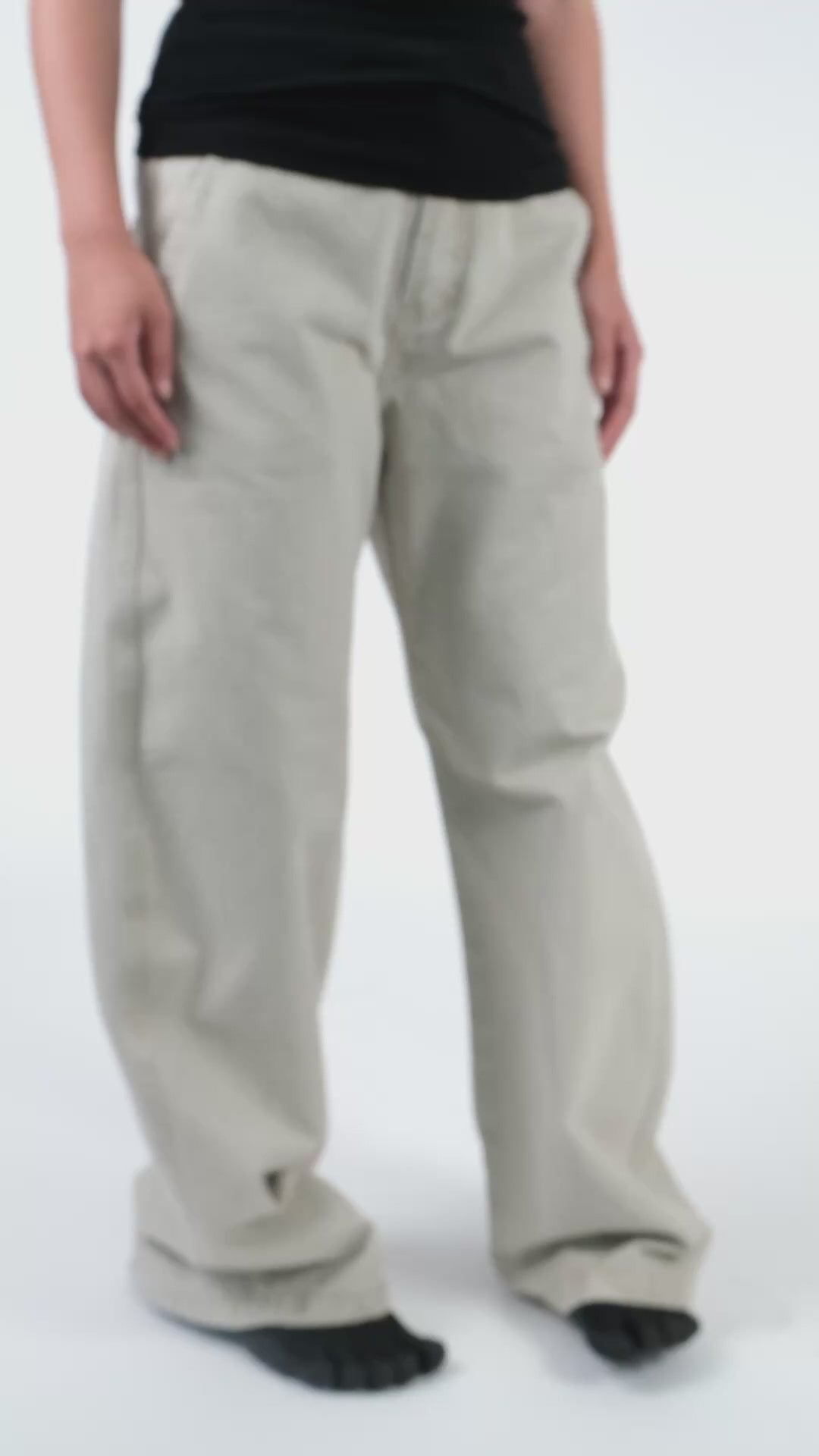 Wide-leg silhouette with a straight cut from hip to hem, offering a relaxed and roomy fit